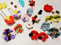 A traditional Japanese craftwork started from Edo period. Fold a square cloth and make a various kind of decorations such as plants and animals. Chirimen crepe and Habutae silk are commonly used. Use more than 100 pieces of fabric at most to make colorful accessories such as Kanzashi.